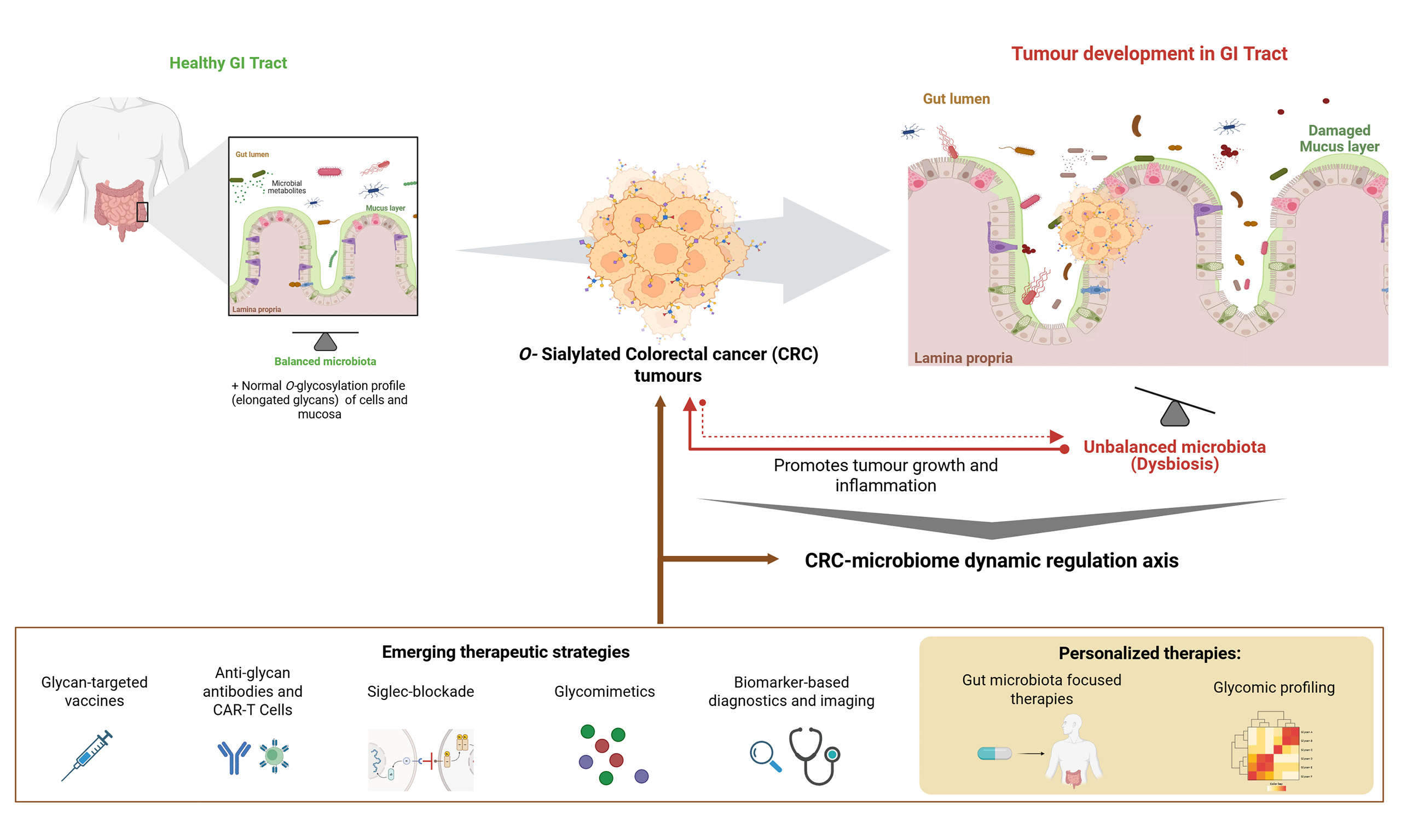 The interplay between glycans and the GI microbiota constitutes a dynamic regulatory axis that is foundational to intestinal homeostasis and strongly implicated in CRC pathogenesis. In this review, we focused on O-glycan sialylation to illustrate the context-dependent role of glycans, serving as protective factors under physiological conditions but contributing to immune evasion, inflammation, and microbial dysbiosis in malignancy. This dual behavior underscores their central role in shaping the tumor microenvironment and highlights their potential as both biomarkers and therapeutic targets.