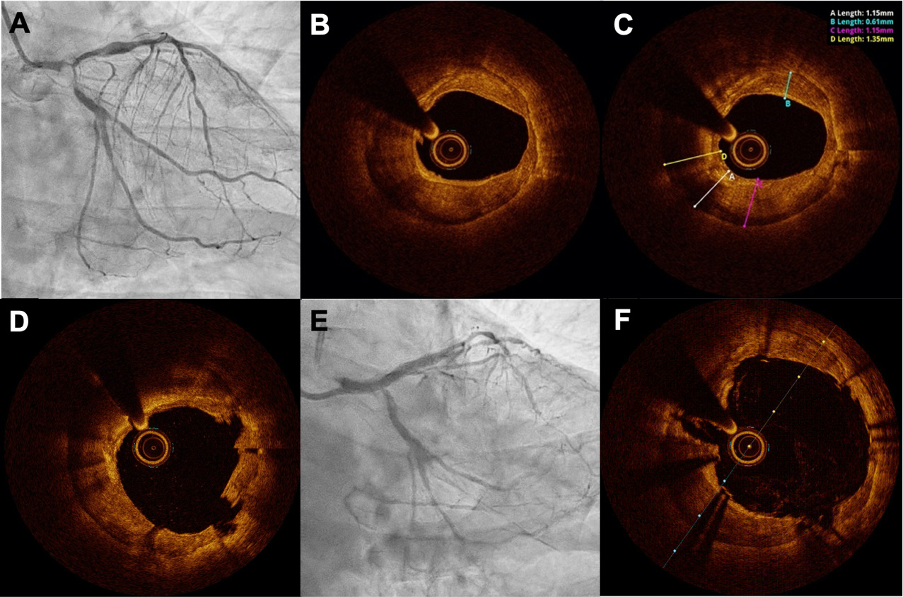 Figure 2. A 74-year-old male patient with severe calcific three-vessel disease presented with critical stenosis at the left main bifurcation (Medina 1,1,1), proximal LAD, OM2, and CTO of the mid RCA (A), who refused cardiac surgery. As the first step,