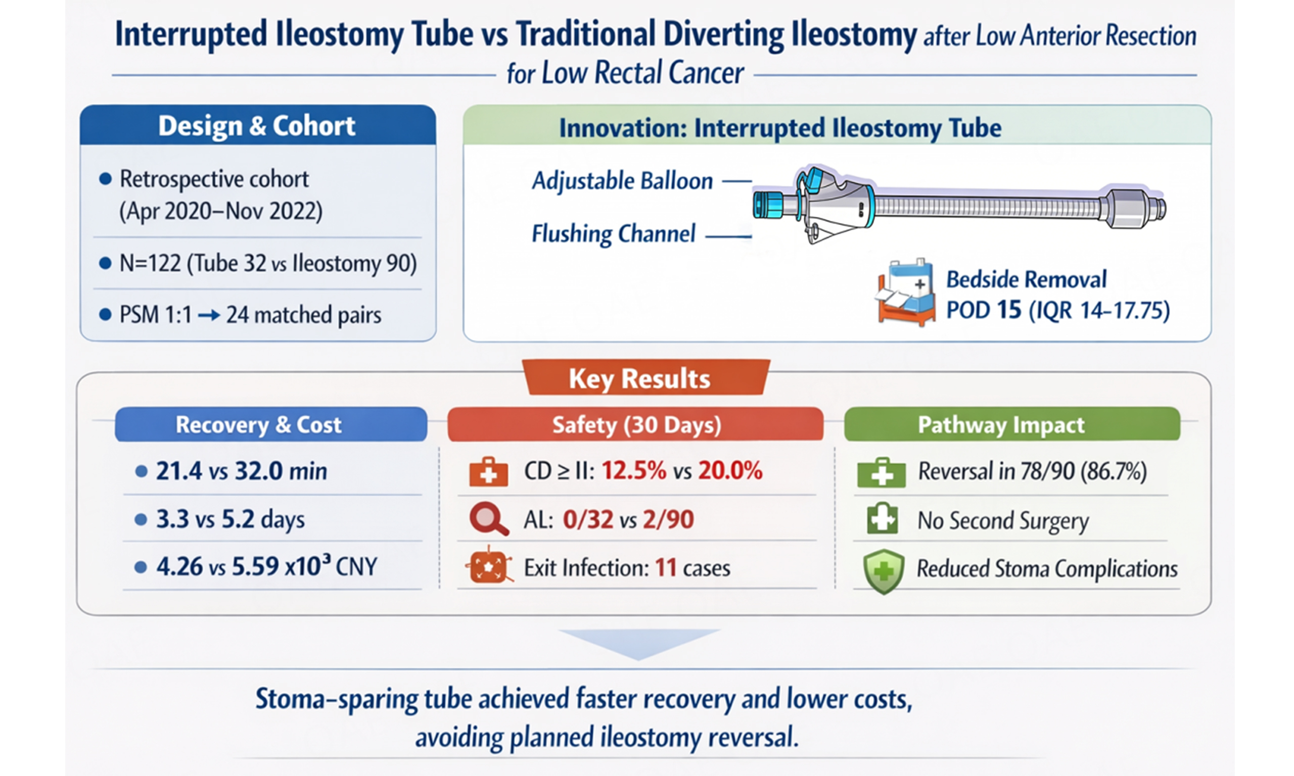 In conclusion, Interrupted Ileostomy Tube provides effective temporary fecal diversion for low rectal cancer surgery while maintaining early postoperative safety comparable to traditional diverting ileostomy. In our cohort, this technique was associated with shorter hospital stay, faster return to oral intake, lower hospitalization costs, and complete avoidance of planned stoma reversal and late stoma-related complications. These findings support Interrupted Ileostomy Tube as a practical alternative to conventional diverting ileostomy in carefully selected patients requiring prophylactic diversion.