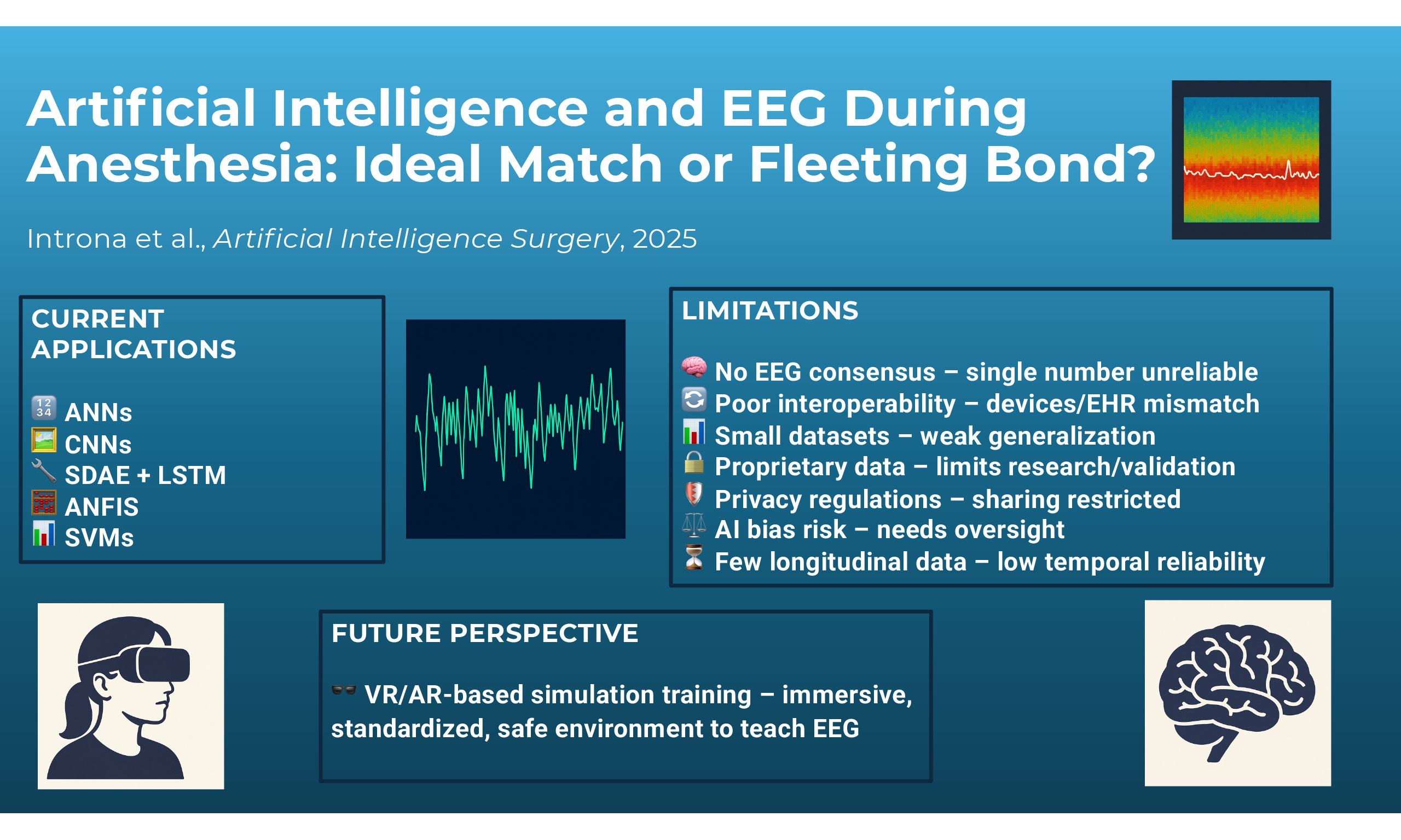 Despite these advantages, the use of VR and AR specifically for training in intraoperative EEG interpretation, which has become a crucial tool in managing anesthesia depth and personalization, remains underexplored. Nevertheless, the potential benefits could be considerable. VR, by creating an immersive environment such as a virtual operating room, would offer a setting in which anesthesiologists could simulate the use of EEG in realistic clinical contexts, without interacting with real patients, while monitoring real-time brain signal variations and adapting anesthesia management accordingly[66].