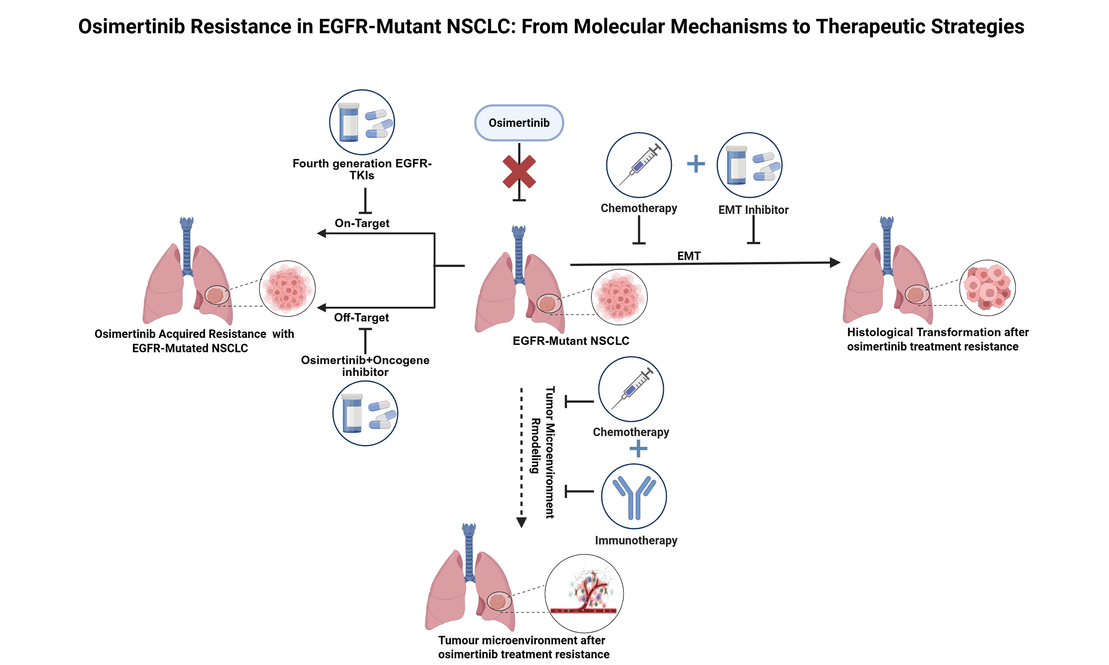 Despite intensive global efforts to delineate resistance mechanisms, repeat tissue and/or liquid biopsies analyzed by integrated multi-omic NGS - including proteomics, spatial transcriptomics, and assay for transposase-accessible chromatin with high-throughput sequencing (ATAC-seq) - fail to identify known resistance mutations or amplifications in 30%-50% of patients progressing on osimertinib, indicating that undefined mechanisms persist. Functional validation of candidate variants emerging from these analyses can be performed in patient-derived organoids or xenograft models to establish their role in resistance, thereby informing trial enrollment and subsequent therapy for later-line patients. Such mechanisms may involve the tumor microenvironment, immune evasion, and unknown genetic mutations or epigenetic regulation.
