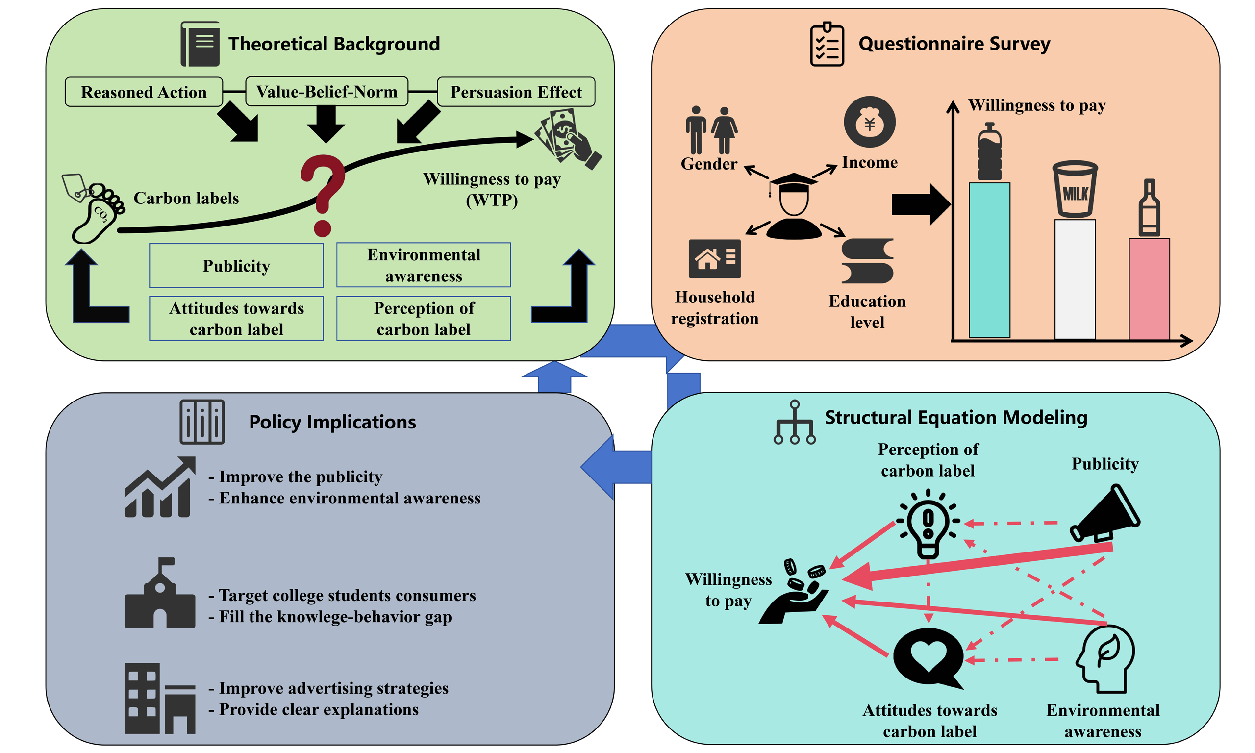 Carbon labels play an important role in guiding responsible consumption and production, yet consumers’ willingness to pay (WTP) for carbon-labelled products remains poorly understood in China. This study proposes a conceptual framework to measure the WTP for carbon-labelled drinks among Chinese college students. Using the contingent valuation method, we collect 1,787 questionnaires and find that college students are willing to pay a price premium of 17.5%, 13.5%, and 12.9% for carbon-labelled mineral water, milk, and wine, respectively. We show that environmental awareness, perception of carbon labels, attitudes towards carbon labels, and publicity positively influence consumers’ WTP in different pathways. Attitudes mediate the effects of environmental awareness and publicity on WTP, while perception influences WTP only indirectly via attitudes. These findings are expected to not only deepen the understanding of the mechanism behind WTP for carbon-labelled products, but also to provide valuable insights into the promotion of carbon labels in China and other emerging economies worldwide.