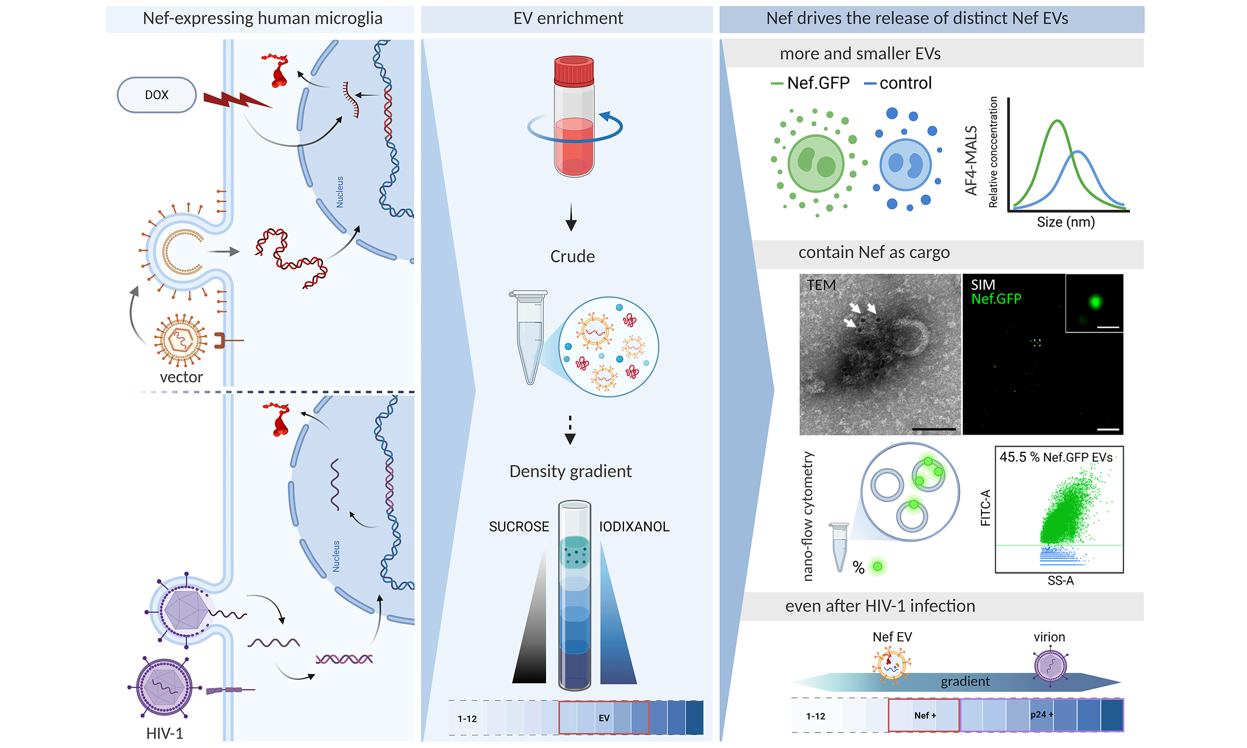 Methods: Here, we systematically characterized extracellular particles released from immortalized human microglia (h-microglia) expressing Nef alone or after HIV infection. Importantly, we established a novel h-microglia model harboring a stably integrated Nef tagged with green fluorescent protein (Nef.GFP) transgene under an inducible promoter. Extracellular vesicles (EVs) were enriched from culture media and analyzed for morphology, size, concentration and molecular composition, including Nef content, by (super-resolution) fluorescence microscopy, (immunogold) transmission electron microscopy, asymmetric flow field-flow fractionation coupled to a multi-angle light-scattering detector, nanoparticle tracking analysis, and nano-flow cytometry and immunoblotting.