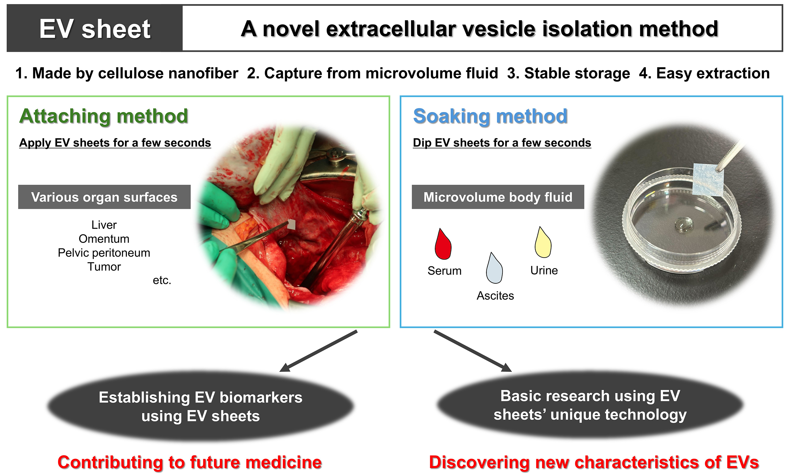 We developed the attaching method, in which an EV sheet is briefly applied to a target site, such as a moist organ surface, enabling direct EV capture from small amounts of ascites on the tissue surface [Figure 2A]. This approach represents an unprecedented strategy for the site-specific capture of individual EVs. Our previous study[16] applied sterilized EV sheets intraoperatively to various intraabdominal tissues, including liver, omentum, pelvic peritoneum, and tumor, in patients with ovarian tumors. EVs collected from the sheets were subsequently isolated and subjected to miRNA sequencing.