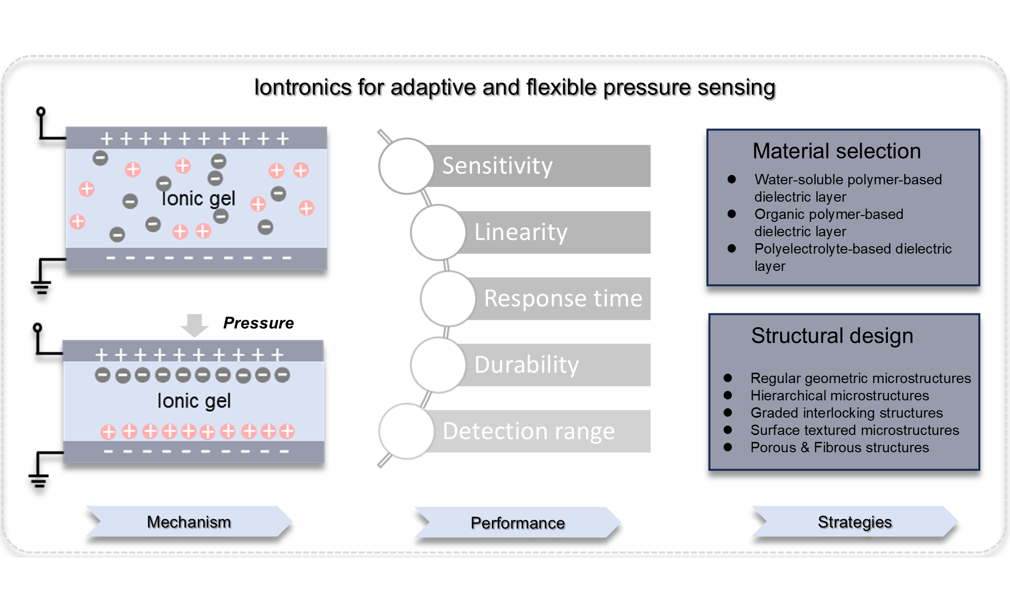 FIPS exploit an EDL-dominated sensing mechanism at the electrode-dielectric interface, offering ultrahigh sensitivity, low-pressure responsiveness, and fast dynamic performance, which are attractive for wearable electronics, e-skin, and health monitoring. However, optimizing performance remains challenging. Material-wise, high-mobility or concentrated ions enhance interfacial capacitance but risk premature EDL saturation or leakage, while water-soluble and organic polymers face environmental sensitivity or complex fabrication. Structurally, low-modulus materials and microstructured surfaces improve low-pressure sensitivity but may compromise linearity and durability under excessive deformation. Mechanistically, the precise modulation of interfacial capacitance and EDL dynamics under pressure is still not fully understood, limiting linear response, distributed sensing, and high-precision measurements.