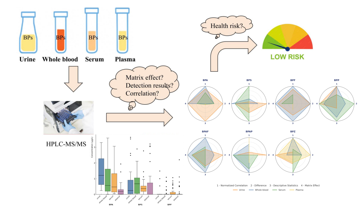 While multi-matrix biomonitoring entails higher costs, our identification of optimal matrices per biomarker enables targeted strategies, thus proposing a cost-efficient approach: for large cohorts, initial screening via urine or whole blood followed by matrix-specific confirmation for key analogs balances accuracy with practical resource constraints. We recommend prioritizing monitoring of BPA in occupational groups and implementing regular regulatory updates on emerging alternatives such as BPAP. Limitations included the small sample size and geographic specificity. Additionally, when assessing health risks based on urinary BPs concentrations, the metabolic proportion of BPs excreted in urine was not accounted for, potentially leading to an underestimate of their health risk. Future studies should incorporate urinary metabolic fractions of BPs into risk models to correct underestimation, validate matrix-specific exposure windows with longitudinal studies, and extend biological monitoring to lipophilic BPs in adipose tissue or breast milk. In summary, the optimal matrix selection scheme for BPs significantly improves the accuracy of exposure assessment and provides a scientific basis for targeted public health interventions.