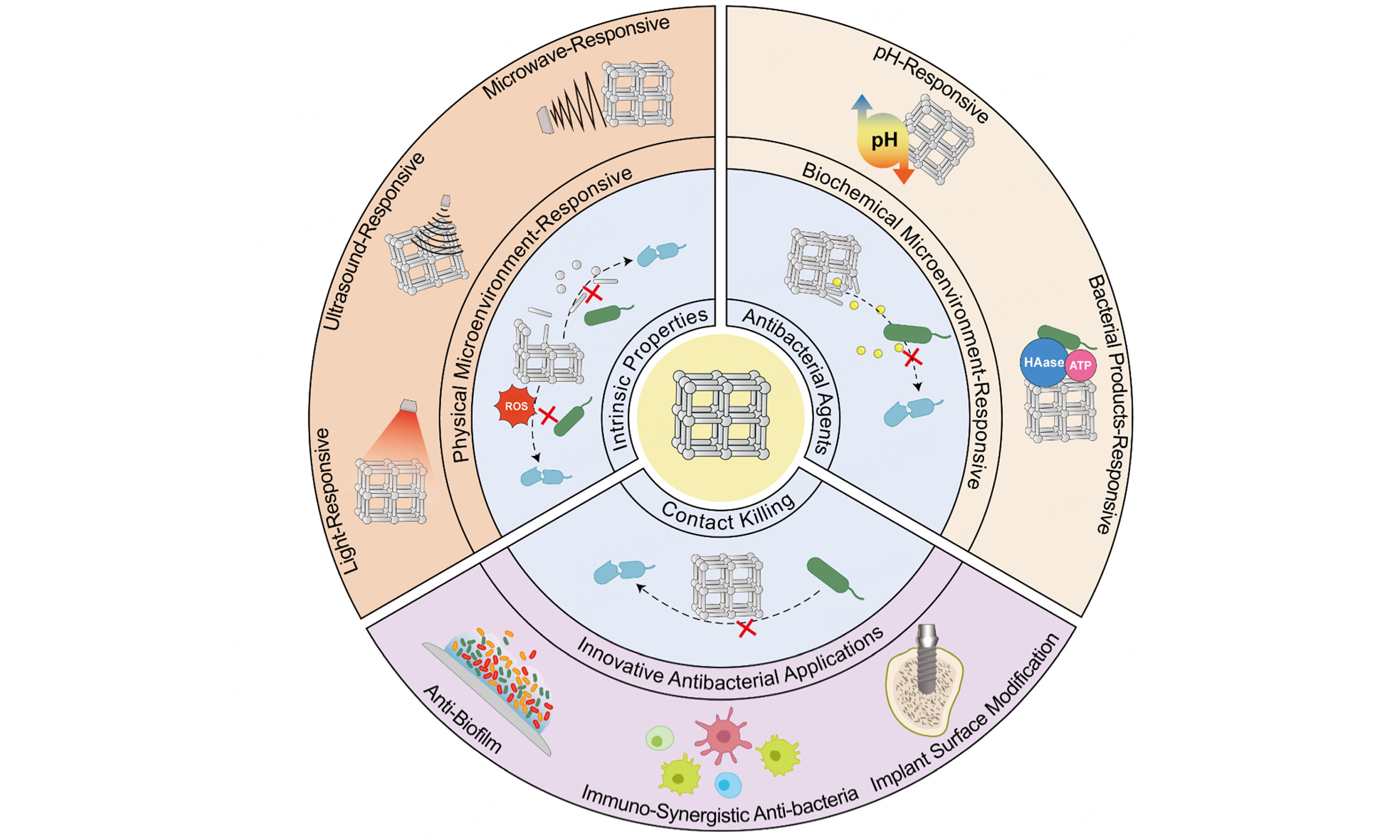 MOF composite materials represent a highly versatile platform for addressing the challenge of clinical bacterial infections. Their multifunctionality renders them potent candidates for engineering antibacterial therapeutic systems. Among the numerous applications, anti-biofilm therapy, immuno-synergistic antibacterial therapy, and implant surface modification have garnered significant attention and demonstrate more promising potential for clinical translation.