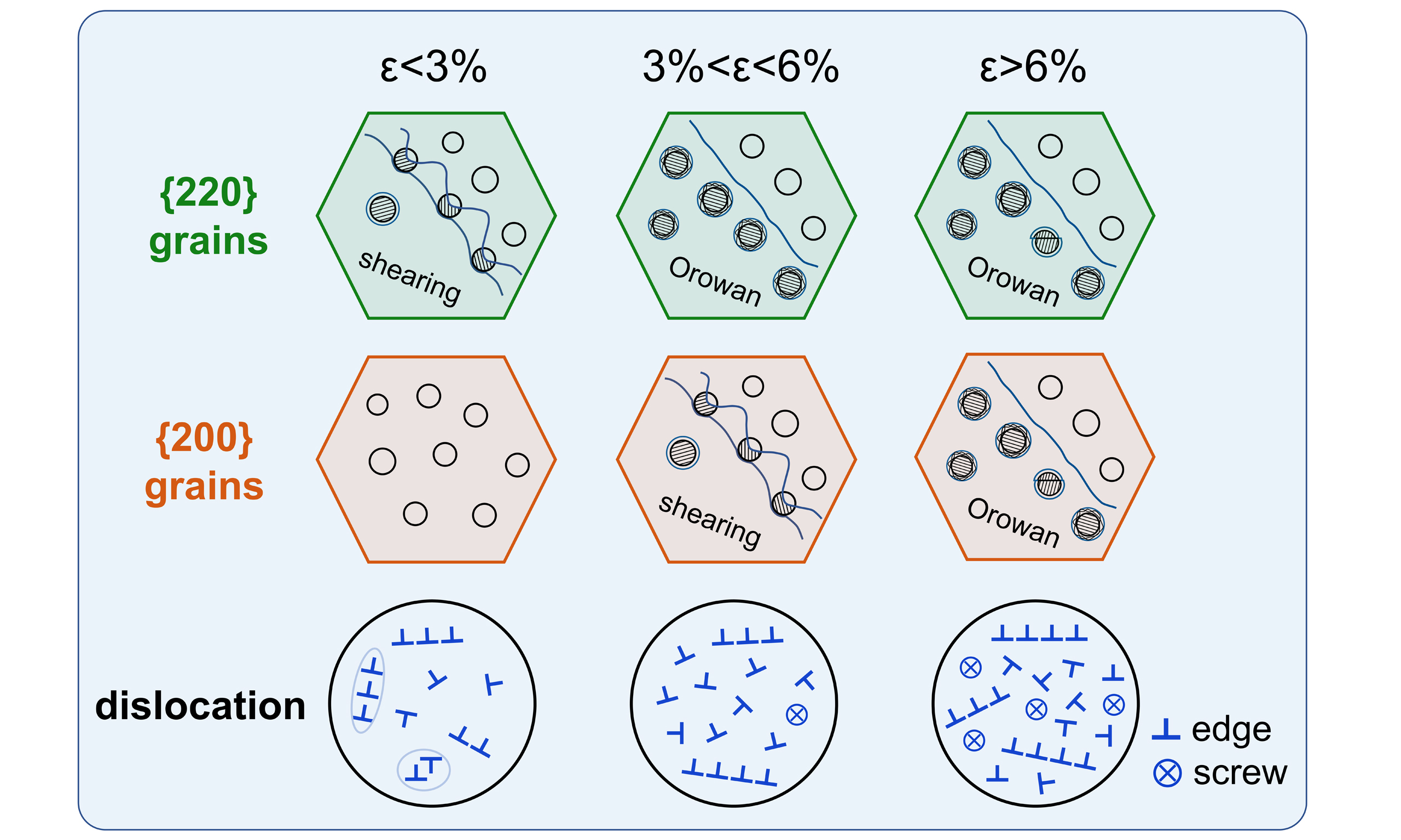 (3) The evolution of work hardening is closely linked to these mechanisms. The late-stage decrease in the work hardening rate is attributed to the activation of localized, restricted cross-slip, which allows dislocations to bypass the high-density obstacle regions created by Orowan loops and accumulated dislocations around precipitates.